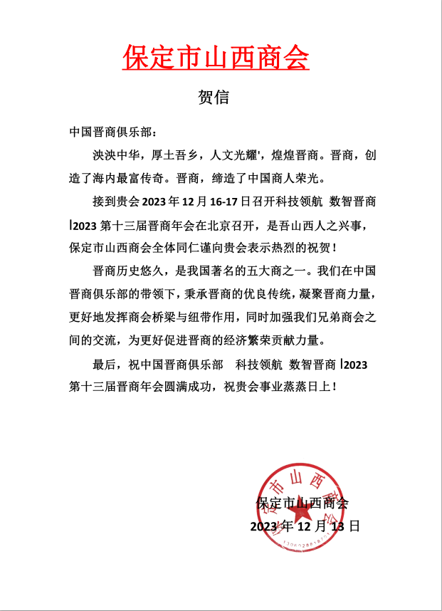 保定市山西商会向晋商年会组委会、中国晋商俱乐部秘书处发来了贺信,预祝2023第十三届晋商年会圆满成功。