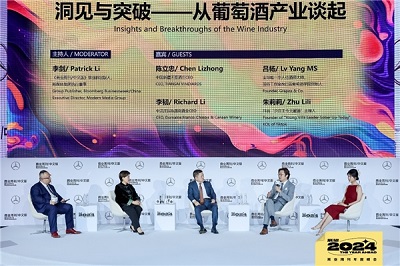 在关于设计与创意的精彩分享之后,一场关于国货红酒品牌的展望顺势拉开帷幕。中国新疆天塞酒庄CEO陈立忠,中法庄园、迦南酒业CEO李韧,全球唯一华人侍酒师大师,顶侍工作室&归普葡萄酒学院创始人吕杨,抖音“少庄主今天醒酒”主理人朱莉莉与《商业周刊/中文版》事业群出版人,超媒体集团执行董事李剑以《洞见与突破——从葡萄酒产业谈起》为主题,在国产葡萄酒与进口葡萄酒,国内红酒的优势与国内优质酒庄建设等方面分享了各自的洞见和预期。