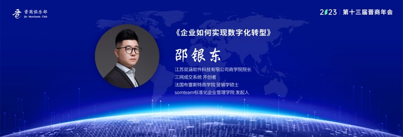2023第十三届晋商年会于12月16日至17日在首都北京召开,主题“科技引领 数智晋商”,江苏双涵软件科技有限公司商学院院长邵银东受邀为在场嘉宾分享《企业如何实现数字化转型》主题演讲。