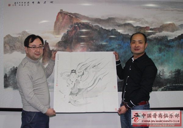 李永红秘书长与中国晋商俱乐部副秘书长关小爱交流和书画艺术作品鉴赏经验,李永红秘书长将自己收藏的甘肃省美术家协会会员、甘肃省书画研究院院士杨晓东先生的一副“飞天献瑞图”赠送给中国晋商俱乐部收藏,表示对“中国晋商俱乐部关于新晋商的全新定义,对山西省甘肃商会支持”的感谢和敬意。