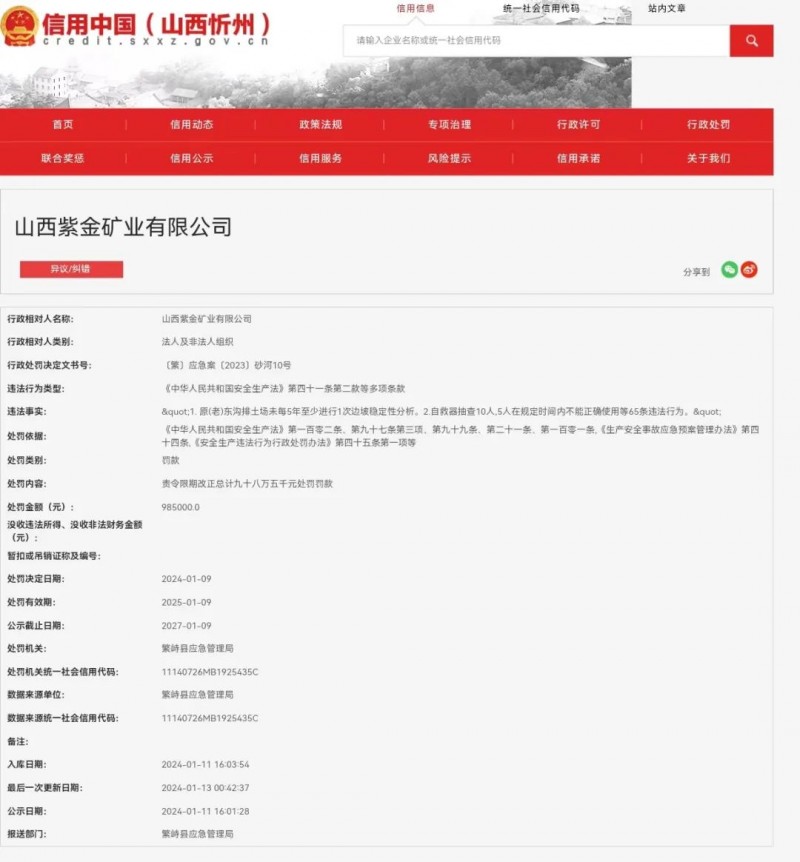 1月11日,国家企业信用信息公示系统显示,山西紫金矿业有限责任公司,新增一条行政处罚,罚款金额为98.5万元,处罚事由是违反《中华人民共和国安全生产法》相关条款。处罚单位为繁峙县应急管理局。