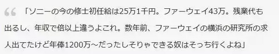 “索尼给硕士的起薪是25.1万日元(1.4万元人民币),华为是43万日元(2.5万元人民币)。还有加班费,年收入要差一倍了!几年前,华为横滨研究所就开出年薪1200万日元(71万元人民币),有能力的家伙都会去的吧!”