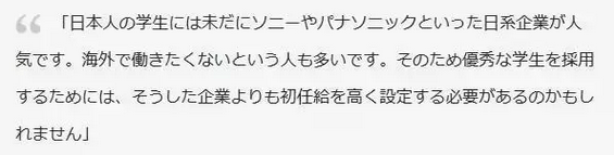 “日本学生还是偏爱索尼、松下等日企。不少人并不想被派到海外工作。为了招募优秀学生,给出足够高薪可能是最简单有效的方法!”