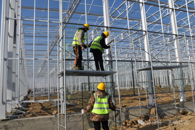 寒冬腊月之际,在铭宸集团日光温室大棚施工现场,却呈现出一片热火朝天的景象,百余名施工人员头戴安全帽,身穿工作服,正在顶着寒风,紧张有序的忙碌着。高耸的钢框架结构褶褶生辉,6个温室的基础和主体骨架已基本完成,玻璃大棚的轮廓愈发清晰,预计今年5月份完工,正式投入使用。