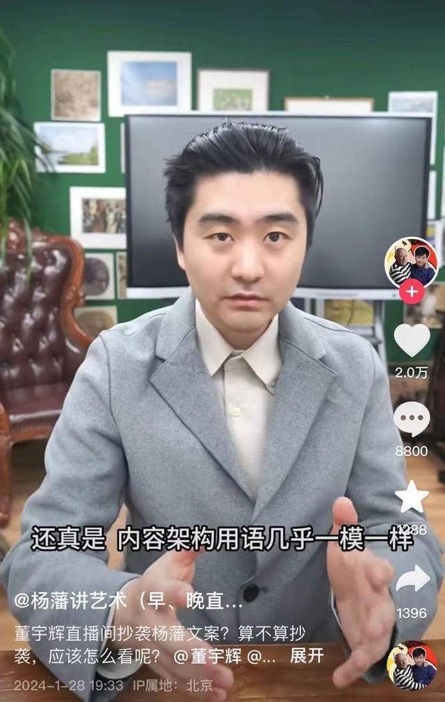 此前,百万粉丝博主“杨藩讲艺术”在抖音发布视频,称与辉同行直播间抄袭自己的文案。该账号显示,杨藩目前有235万粉丝,其作品量280余个,其简介为:“北京美协理事、首都师学前学院美育中心主任、中央美院毕业、中国美协会员、博士”。