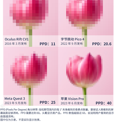 最好的手机、电脑或电视的屏幕贴在眼前,1°范围内只能看到几个像素。去年9月发布的Quest 3用了特制的Fast-LCD屏幕,把这个数字做到了25,画质依然不够好。而索尼造的Micro OLED能把这个数字做到40左右。