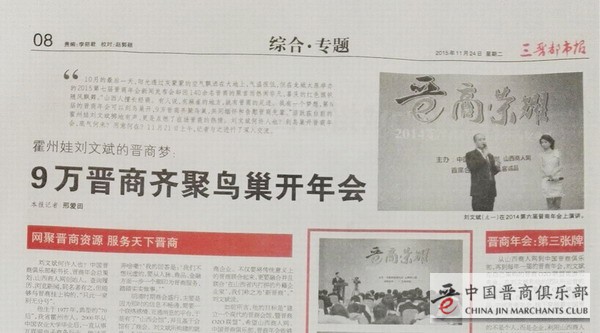 在刘文斌看来,2015年是值得浓墨重彩书写的一年。就在这一年,他已将中国晋商俱乐部的联合发起机构扩展到了58家(包括北京市山西企业商会、天津市山西商会、太原新晋商联盟、湖北省晋商商会、浙江省山西商会、山西省民营经济促进会、中华晋商会等),并且在多地设立了中国晋商俱乐部运营中心。今年10月份,他启动了“晋商优品”平台战略,致力于打造新时代的“晋商会馆”,努力实现着晋商O2O联盟从人脉平台向商贸平台的战略升级。