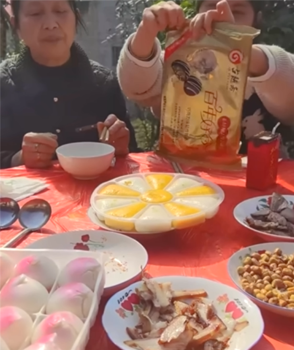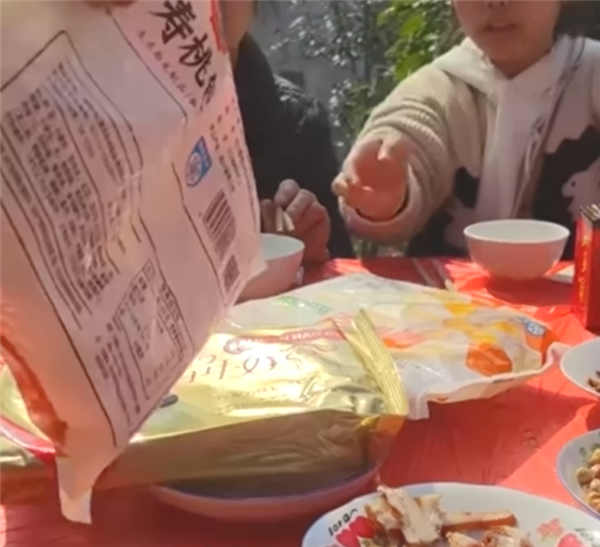 据悉,主人家没有请厨师,也没有准备家常菜,直接购买了各式各样的罐头和袋装预制菜。