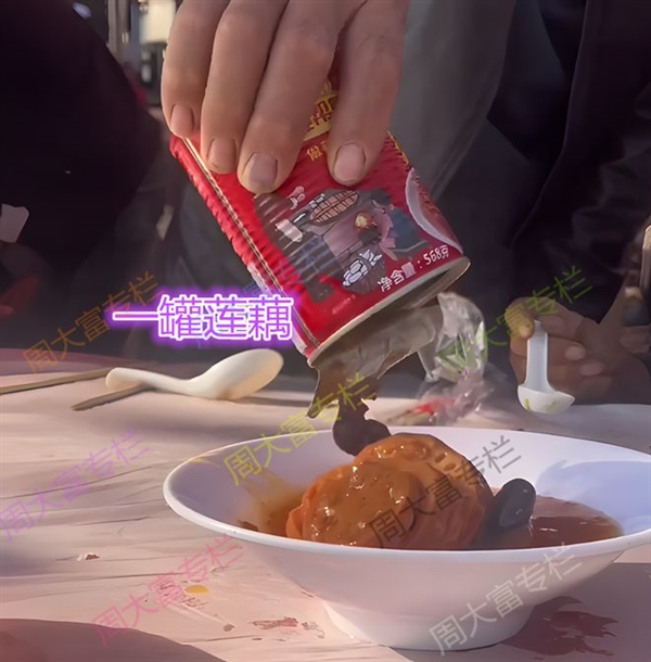 就在去年12月初,安徽亳州也出现了类似的情形,酒席上出现的并非热腾腾的炒菜,而是一瓶罐头,需要自己打开,倒出的是一些藕片。