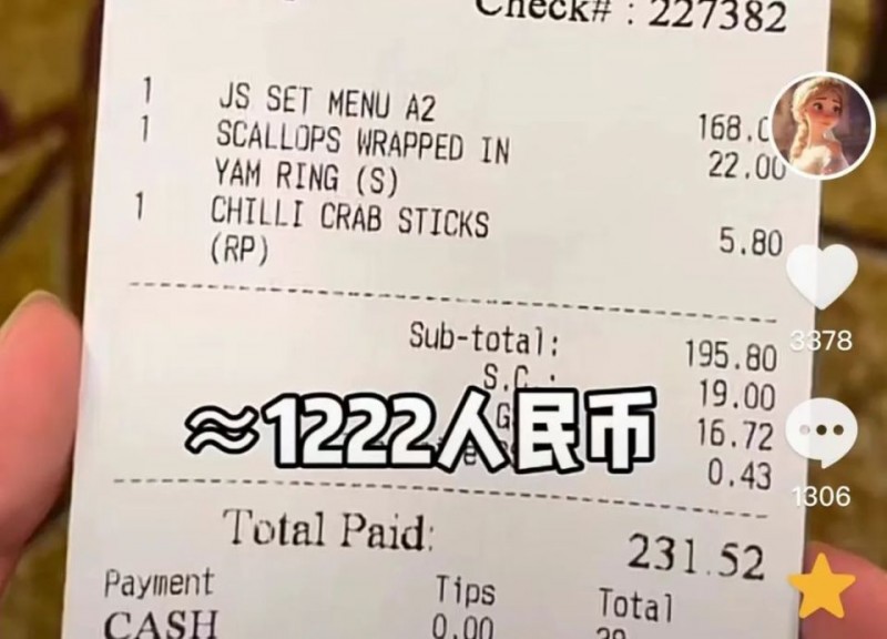 至于正餐,更是一把辛酸泪。网友只点了一道新加坡名菜珍宝辣蟹,结账的时候就花出去1222人民币。