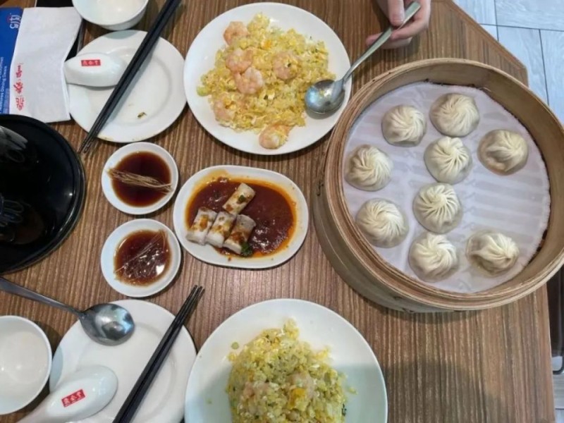 一顿早餐,人均300人民币左右。吸取了早餐的教训,下午出门吃饭,馍人点餐时谨慎了起来。一道蒜泥白肉、一盅排骨汤、一份小笼包、一盘虾仁蛋炒饭,外加一份蒜炒菠菜。