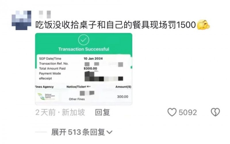 在互联网搜索新加坡,评论区看到最多的帖子就是晒罚单。网友这顿饭不知花了多少人民币,但没收拾桌子和餐具的罚款就高达1500多块钱。两次罚款,就足够支付北京一间卧室的月租。