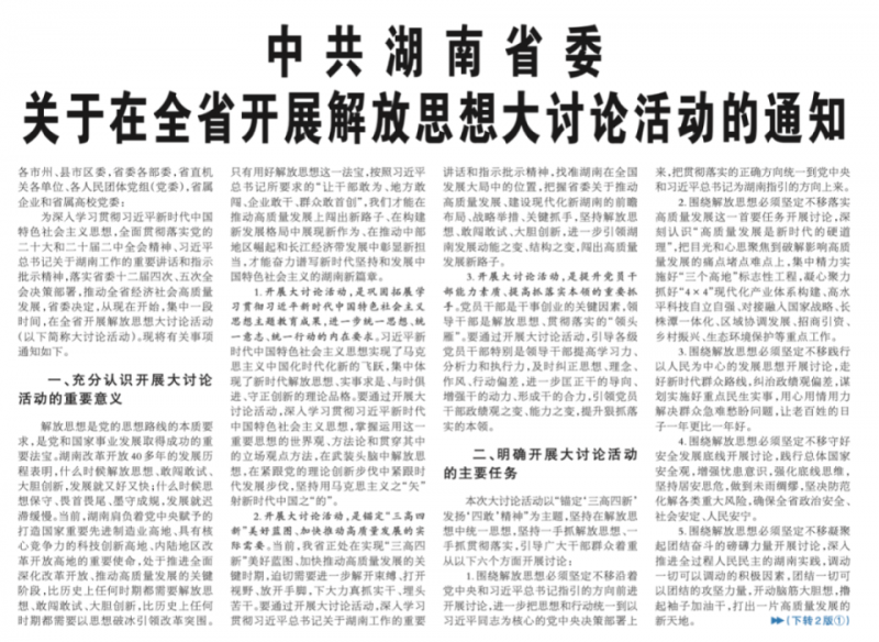 2024年2月18日对外公布的《中共湖南省委关于在全省开展解放思想大讨论活动的通知》提到:
