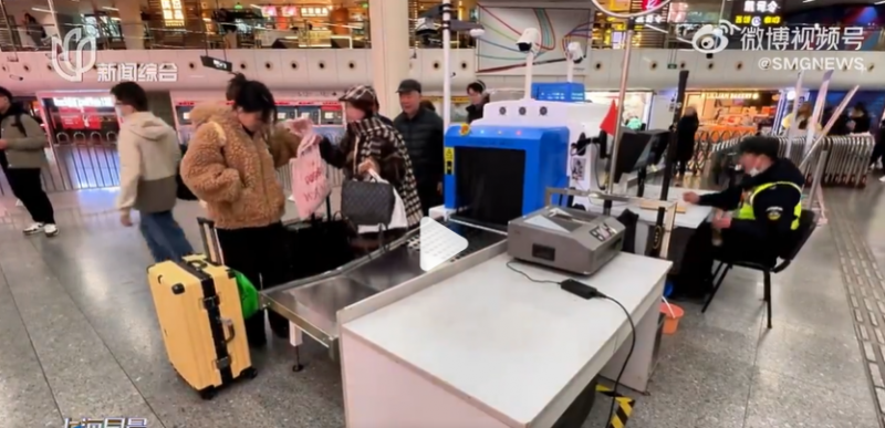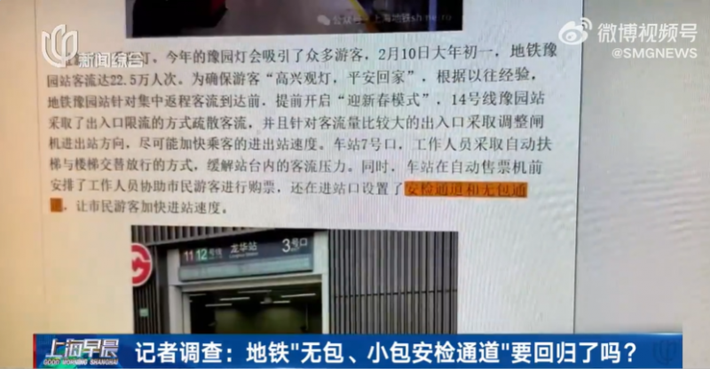 春节期间,有网友发现,上海部分地铁站点的安检有了变化,在进站口设置了无包通道,加快市民游客的进站速度。