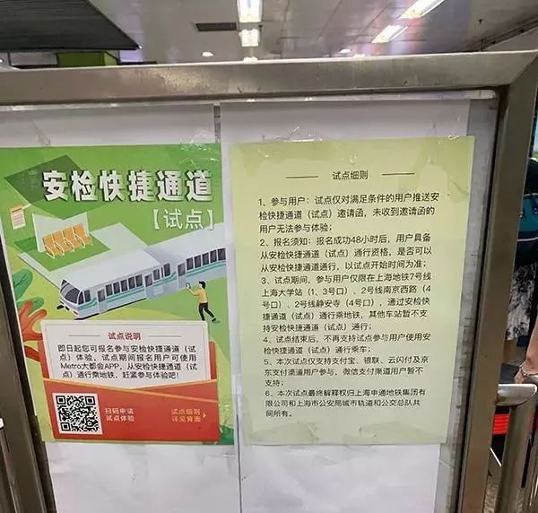 其实,前几年,上海部分车站曾推出过安检快捷通道试点。2019年,上海地铁曾在7号线上海大学站、2号线南京西路站、2号线静安寺站这三个站点推出“安检快捷通道”试点活动,乘客可通过支付宝、云闪付等渠道申请参与体验。