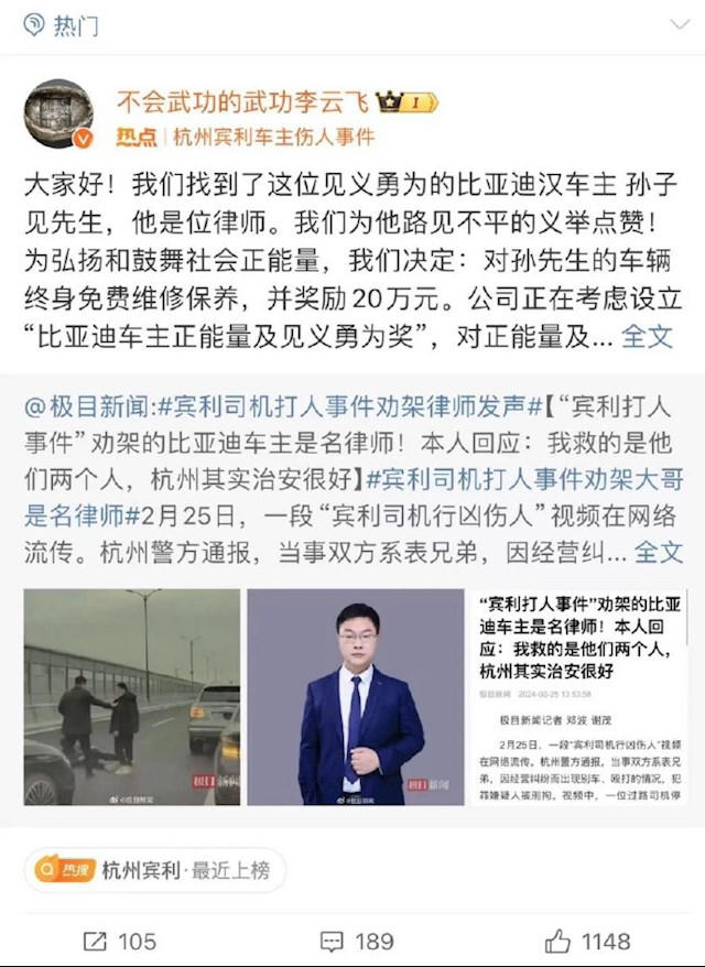 当然了,如此行为也是得到了比亚迪的认可,后者表示,找到了这位见义勇为的比亚迪汉车主孙子见先生,他是位律师。我们为他路见不平的义举点赞!为弘扬和鼓舞社会正能量,我们决定:对孙先生的车辆终身免费维修保养,并奖励20万元。