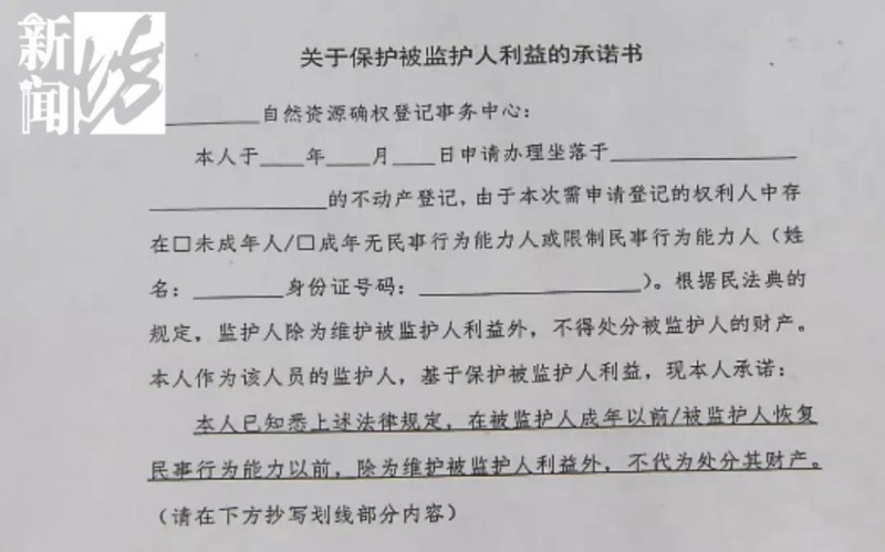 这张承诺书会在不动产登记大厅内,由窗口工作人员提供,监护人需在工作人员见证下签署。除了承诺书外,是否还需要提供其他材料,各区目前的实操并不相同,仍要以窗口审核为准。