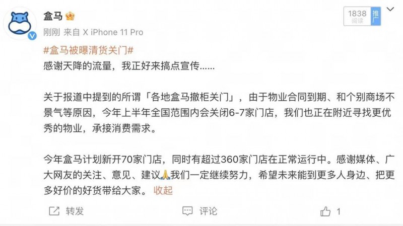 此前,有报道称,各地盒马在近期传出撤柜关门的消息。随后,#盒马被曝清货关门#的话题也登上微博热搜。