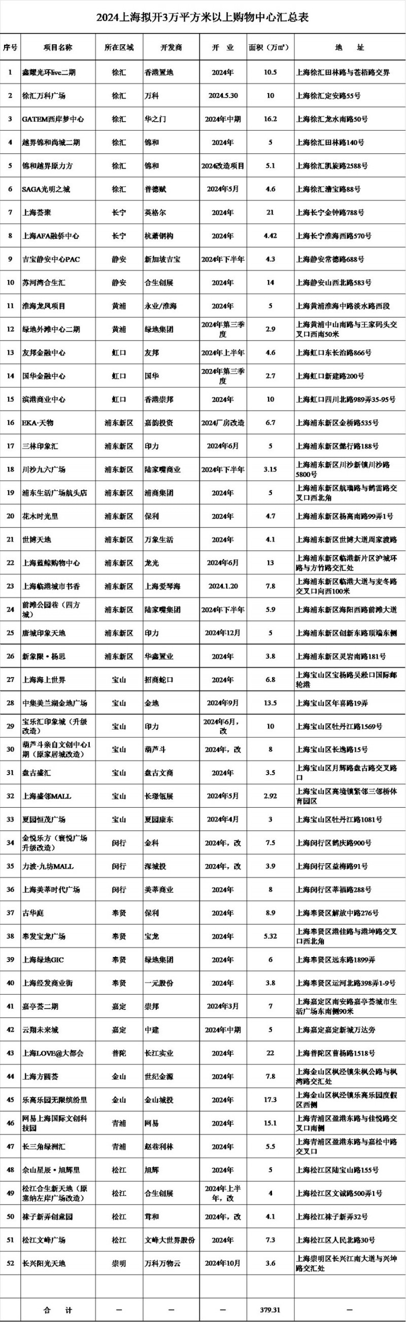 另据记者从上海购物中心协会获悉,2024年,上海购物中心行业继续突飞猛进,拟新开3万平方米以上购物中心(含旧改项目)达52家(见附表),面积380万平方米,创5年来新高。其中10万平方米以上有12家,面积172.6万平方米,旧改项目11家,面积68万平方米。