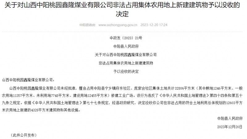该企业于2023年12月,刚刚因为非法占用土地被中阳县处罚罚没。