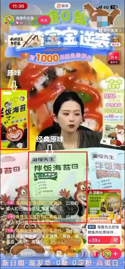此外,在对“海狸先生海苔碎厂家直销”直播间一款名为海狸先生拌饭海苔产品的调查中发现:直播间背景宣传“0糖0盐”;主播面前共出现4种颜色/包装口味的产品,右下角购物车显示讲解中的产品配图为海狸先生即食鳕鱼肉松原味拌饭;主播在讲解配料表时以原味、经典原味举例:“只有白芝麻、黄金亚麻籽、玉米油、芝麻油、橄榄油、海藻油,配料表干干净净的,经典原味,孩子们6个月以上,能吃辅食的都是能吃的,0盐0糖,高钙、高铁、高硒。”实际收到样品包装为原味口味,其配料表中却添加了海藻糖、食用盐,主播宣称与产品配料不符。