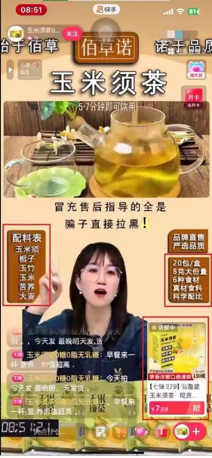 在对“玉米须茶0糖0脂无乳糖”直播间一款名为玉米须茶的调查中发现:直播间背景宣传“玉米须茶0糖0脂无乳糖”;主播口播宣传“6种食材科学配比,里面有玉米、玉米须、大麦、栀子、苦荞、玉竹,不含糖、不含色素、不含香精、不含防腐剂”。视频右下角的画面配图为“玉米须茶150g”;主播左手配图为“配料表:玉米须、栀子、玉竹、玉米、苦荞、大麦”;右手配图为“20包/盒、8克大分量、6种食材、真材实料、科学配比”。
