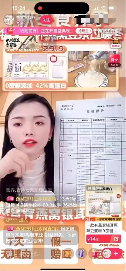 在对“燕窝银耳豆浆粉直销”直播间一款名为燕窝银耳豆浆粉的调查中发现:主播口播宣称“没有添加糖精色素防腐剂,所有的都没有添加,不能吃甜的都能去喝”;产品包装宣称“无添加蔗糖,无添加香精,0反式脂肪酸(生产过程中蔗糖添加量为0%,食用香精添加量为0%,反式脂肪酸添加量为0%)”;视频背景中展示“0蔗糖添加,42%高蛋白”。主播在介绍时为了表现产品的真实性,还展示了产品检测报告。实际检测显示:蛋白质实测值为8.30g/100g,远低于产品包装及视频背景宣称;钠实测值为51.7mg/100g,不满足GB 28050-2011中钠标示值的允许误差范围;蔗糖含量为1.1g/100g,无法判断是否为添加或原料带入。该产品不仅不符合国家强制性标准,主播还拿出产品检测报告佐证产品质量,更能吸引消费者放心购买,涉嫌欺骗行为。