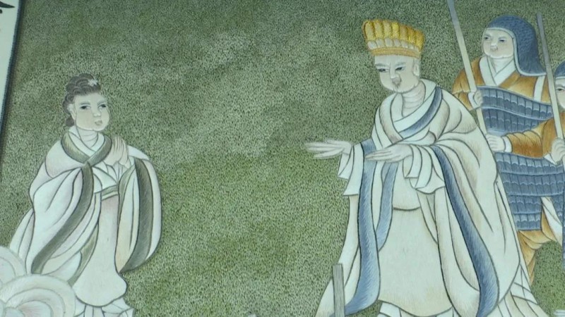 刺绣是赵翠林的生活方式,也是她一生不懈的追求。今年41岁的赵翠林是土生土长的高平人,受父母的影响,她从小就对刺绣格外钟情。2018年,在高平绣活领域小有建树的赵翠林决定将我国保存面积最大的宋代寺观壁画——开化寺宋代彩绘壁画进行刺绣再创作。但由于年代久远,壁画上许多地方线条模糊,部分区域褪色严重,想要把它完整地绣出来,对赵翠林来说是个不小的挑战。“现在我们绣了两年多了,因为它的难度比较大,所以绣起来非常困难,但是要力求它的完整性,一定要达到它原来金碧辉煌的那种效果,所以我们在颜色上比较讲究,请教了许多专家,力求它的颜色和原来的颜色基本上一致,线条也不能模糊不清,我们要补充完整,还有针法上面采取了高平绣活独有的几十种针法,我们要用不同的针法来表现它的画面,一定要让这幅作品绣完以后,达到代表作的高度。”