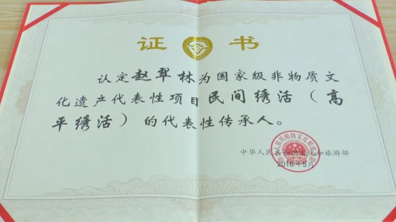 认定的路就不会回头,直到走出一条属于自己的路。正是凭着这股韧劲,多年来,赵翠林不仅熟练掌握了高平绣活的关键性工艺技术和各种绣法针法,形成了自己的技艺特点和独特风格,成为国家级非物质文化遗产代表性传承人,还多次参加国内外非物质文化遗产展览并获奖无数。