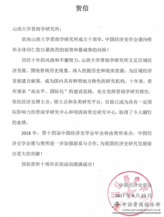 本次研讨会期间,正值山西大学晋商学研究所成立十周年之际,中国经济史学会、《中国经济史研究》杂志社、南开大学经济史研究中心、北京大学经济学院、中央财经大学经济史研究中心、中国人民大学财政金融学院、辽宁大学比较经济史研究中心、中南财经政法大学经济史研究中心、河南大学经济社会发展研究中心、广东外语外贸大学中国计量经济史研究中心、山西社科院历史所、山西社科院晋商文化研究中心等单位以贺电、贺信等形式表示祝贺,对山西大学晋商学研究所在科学研究、人才培养、服务社会等方面取得的成绩表示赞许,也真诚期望与研究所继续加强交流与合作,为我国的经济史研究和经济社会发展作出更大的贡献。