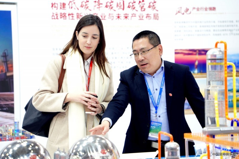 3月26日,几名外国参观者在一家国内氢能源企业展台前与参展商交流。新华社记者 潘旭 摄