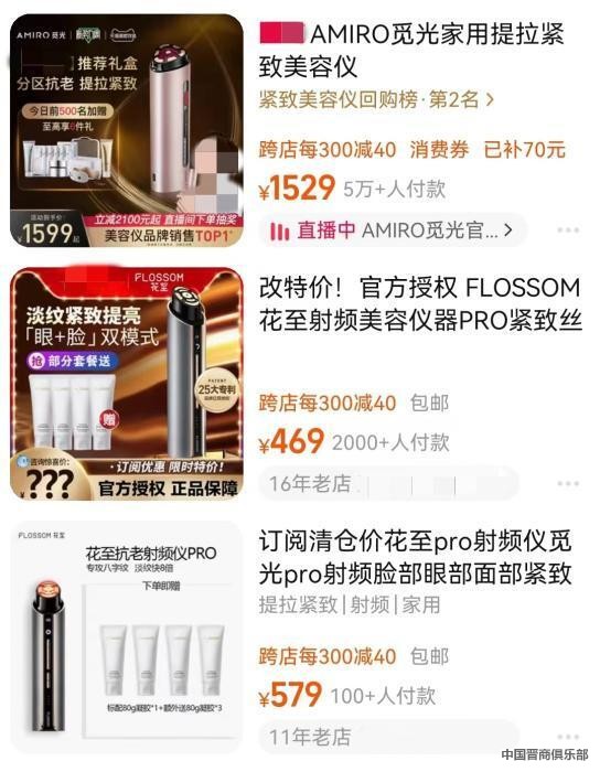 “原价4654元的花至抗老射频仪pro,现在只要1899元”“限时直降2000元,极萌大熨斗12极射频美容仪只需1619元”“立减2100元起,觅光射频美容仪降至1529元”……