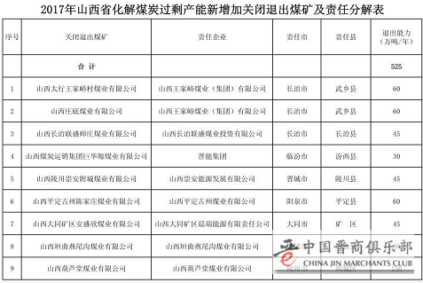 山西省政府办公厅10月12日发文:《关于分解下达2017年煤炭行业化解过剩产能新增加目标任务的通知》指出,为培育和发展先进产能,加快淘汰落后产能,促进山西省煤炭产业结构调整,经省政府同意,并按规定报钢铁煤炭化解过剩产能和脱困发展部际联席会议办公室备案,现将2017年新增加关闭9 座煤矿(退出产能525 万吨/年)目标任务分解下达。
