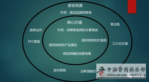 依靠品牌的“核心价值”,让消费者能够持续选择它们的产品,依靠创意活动的“感官刺激”,激活品牌的新鲜感。