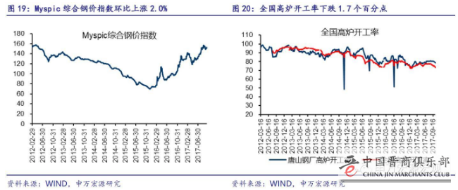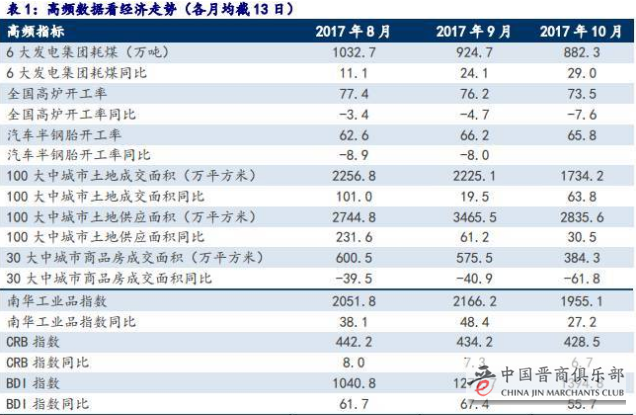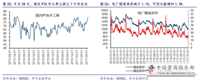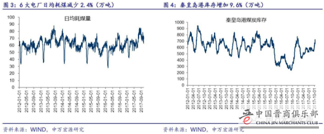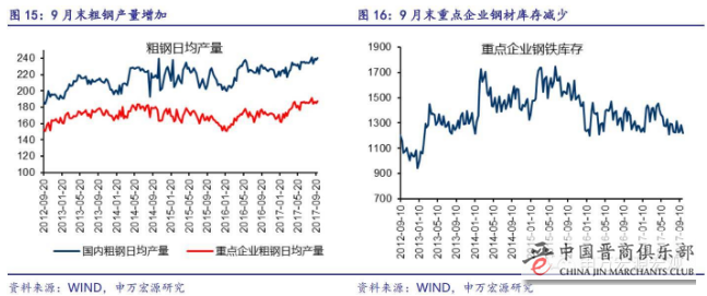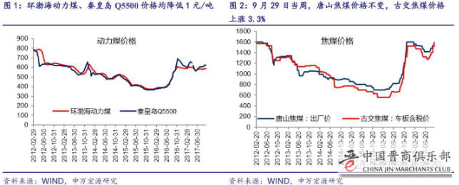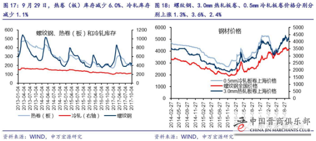 煤炭:耗煤减少,库存增加。本周6大电厂日均耗煤减少2.4%,10月13日,秦皇岛港煤炭库存增加9.6%。环渤海动力煤价格为585元/吨,秦皇岛Q5500价格623元/吨,均较9月底下降1元/吨。9月29日当周,唐山焦煤价格不变,为1520元/吨;古交焦煤价格上涨3.3%,至1590元/吨。根据申万宏源煤炭观点,新建产能持续释放,环保限产导致需求下滑,未来煤价下跌预期增强。特别地,焦煤需求端因取暖季受取暖机环保限产受较大影响,预计四季度焦煤价格将会持续下跌。