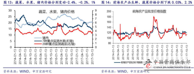 农产品:蔬菜、水果价格下跌,猪肉价格上涨。与9月29日数据相比,农业部28种重点监测蔬菜价格下跌2.4%,7种重点监测水果价格下跌0.2%,猪肉价格上涨1.0%。前海农产品生鲜价格下跌0.03%,蔬菜价格下跌2.20%。