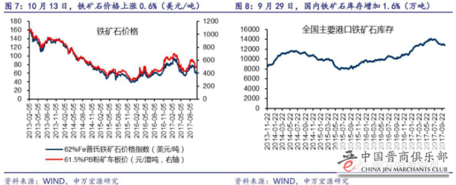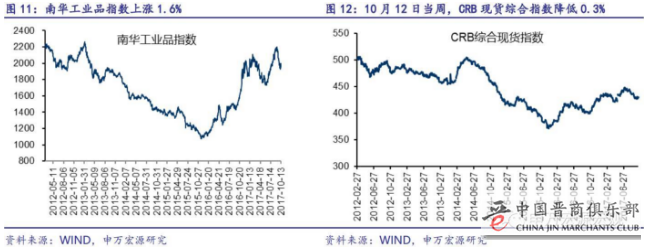 铁矿石:价格上涨,库存减少。本周铁矿石价格上涨0.6%,库存减少1.6%。CRB指数:10月12日当周CRB现货指数降低0.3%。