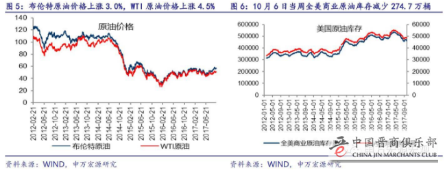 原油:价格上涨。本周布伦特原油价格上涨至57.18美元/桶,环比上涨3.0%。WTI原油价格为51.41美元/桶,环比上涨4.5%。10月6日当周EIA原油库存4.62亿桶,较前一周减少274.7万桶;API原油31.0万桶至4.88亿桶。截至10月6日当周,美国钻机数量为936台。申万宏源石油化工组认为,飓风将会影响美国原油供给,同时预计后期中国原油的进口需求仍将持续,油价仍有支撑。