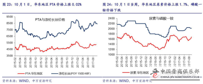 化工:开工回落。与9月28日相比,国内PTA开工率下跌3.0个百分点,涤纶长丝价格下跌;10月1日当周,华东地区PTA开工率上涨0.02个百分点,华东地区尿素价格上涨1.7%,磷酸一铵价格降低。