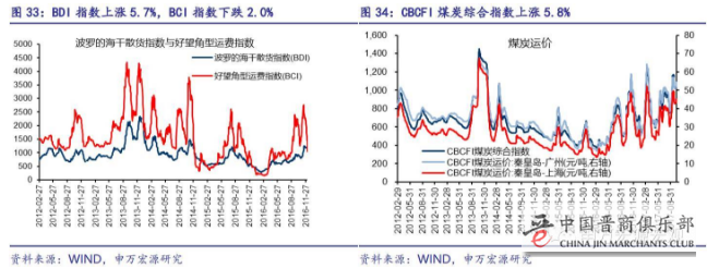 交通运输:BDI指数上涨,BCI指数下跌,SCFI指数上涨,CCFI指数下跌。10月13日当周BDI指数上涨5.7%,BCI指数下跌2.0%;与9月29日数据相比,SCFI上涨1.3%,CCFI下跌3.8%。煤炭运价上涨:与9月29日数据相比,CBCFI煤炭综合指数上涨5.8%,其中CBCFI秦皇岛-广州运价上涨6.9%,秦皇岛-上海运价上涨5.6%。