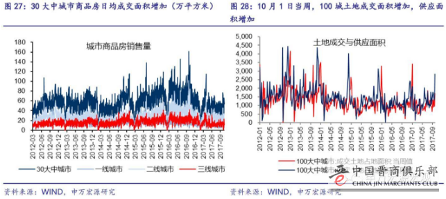 房地产:销售面积、土地成交面积、土地供应面积均增加。本周30大中城市商品房日均成交面积增加,一、二、三线城市均增加。10月1日当周,100大中城市土地成交面积增加,一、二、三线城市均增加;100大中城市土地供应面积增加。