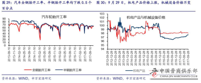汽车:产量增加,开工下行。根据乘联会数据,9月第四周的零售同比增长10%,增长总体较平稳。汽车生产方面,与9月30日数据相比,汽车全钢胎开工率、半钢胎开工率均下跌0.5个百分点。