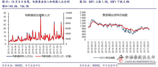 休闲消费:电影票房及观影人次增加。10月8日当周,电影票房收入和观影人次分别增加143.6%、136.3%。据中国票房网,10月14日当周,票房冠军是《羞羞的铁拳》,报收3956.8亿,票房占比38.7%。