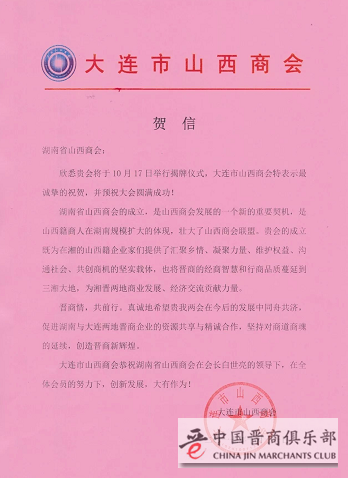 大连市山西商会(中国晋商俱乐部联合发起机构)发去贺电,对湖南省山西商会的成立表示祝贺。希望和湖南省山西商会携手,共续晋商辉煌!