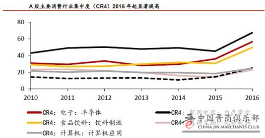 华泰证券表示,A 股主要消费行业的产业集中度(以CR4 衡量)2016年起出现显著提高。消费行业需求稳定,龙头公司壁垒高,在产业集中度提高过程中,理应享有更高估值溢价。