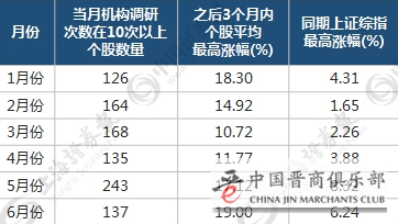 6月份有137只个股机构调研次数在10次以上,之后3个月内平均最高涨幅为19.00%,远超同期上证综指6.24%的最高涨幅。
