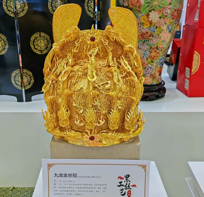除了纯银累丝鎏金《马拉车》外,参观者还对纯银累丝鎏金《九龙冠》、铜累丝鎏金嵌宝石烧蓝《全家福》、纯银累丝鎏金结珠铺翠《天官赐福凤冠》等产品十分感兴趣。