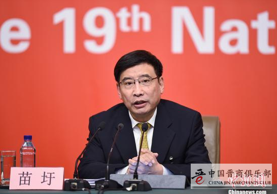 10月19日,中国共产党十九大新闻中心在北京梅地亚中心举行集体采访,就"走新型工业化道路"的主题邀请党员代表接受采访。图为工业和信息化部党组书记、部长苗圩回答记者提问。 中新社记者 侯宇 摄
