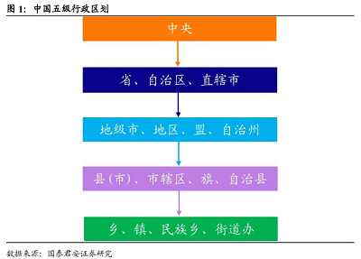 在中国的行政架构中,中央-省(自治区、直辖市)-市(地区、自治州、盟)-县(区、县级市)-乡镇(街道)构成5级行政体系。