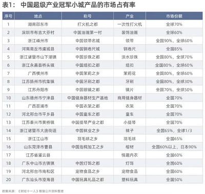 杭集的牙刷、丹阳的镜片、平乡的童车、诸暨的袜子、永嘉的纽扣、古镇的灯饰、江山的羽毛球、荔浦的衣架、澄海的玩具礼品,在全球市场份额中,都是独树一帜。